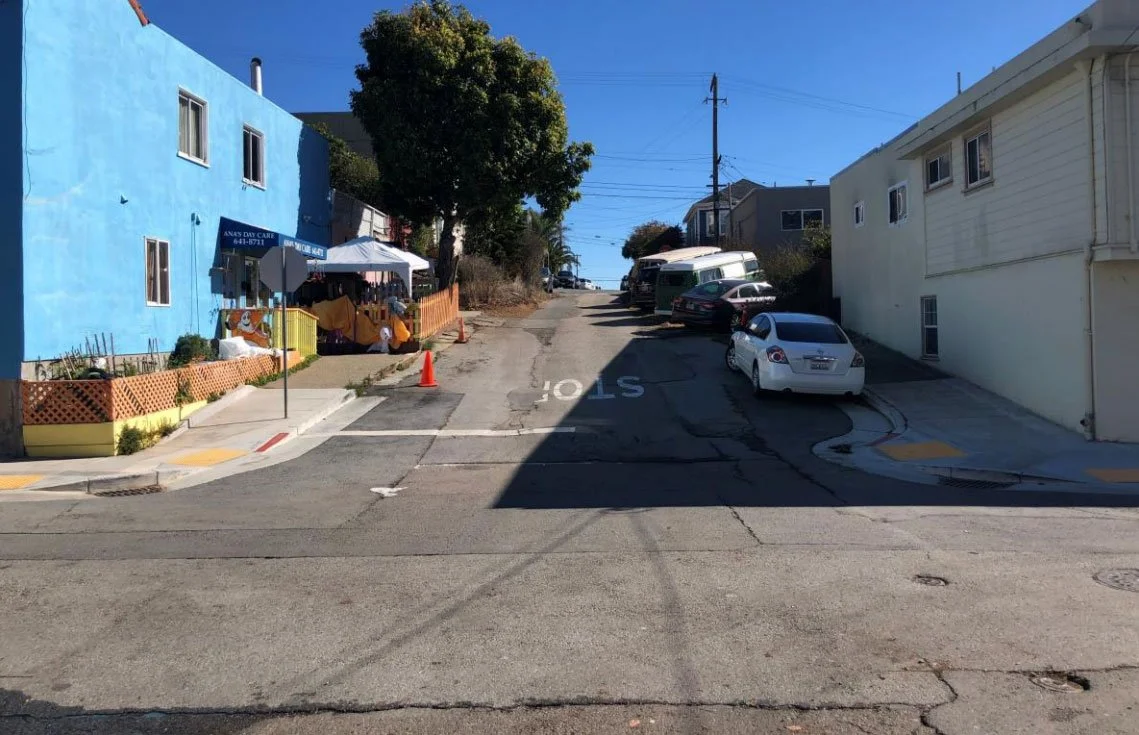 The 400 block of Ogden Avenue (between Folsom and Gates) is an “unaccepted” street, meaning it is not maintained by the city. It has no sidewalk. Yet, it is a much-traveled pathway to the bus stop, for local parents walking their toddlers to Ana’s Childcare, and for neighbors walking their dogs.